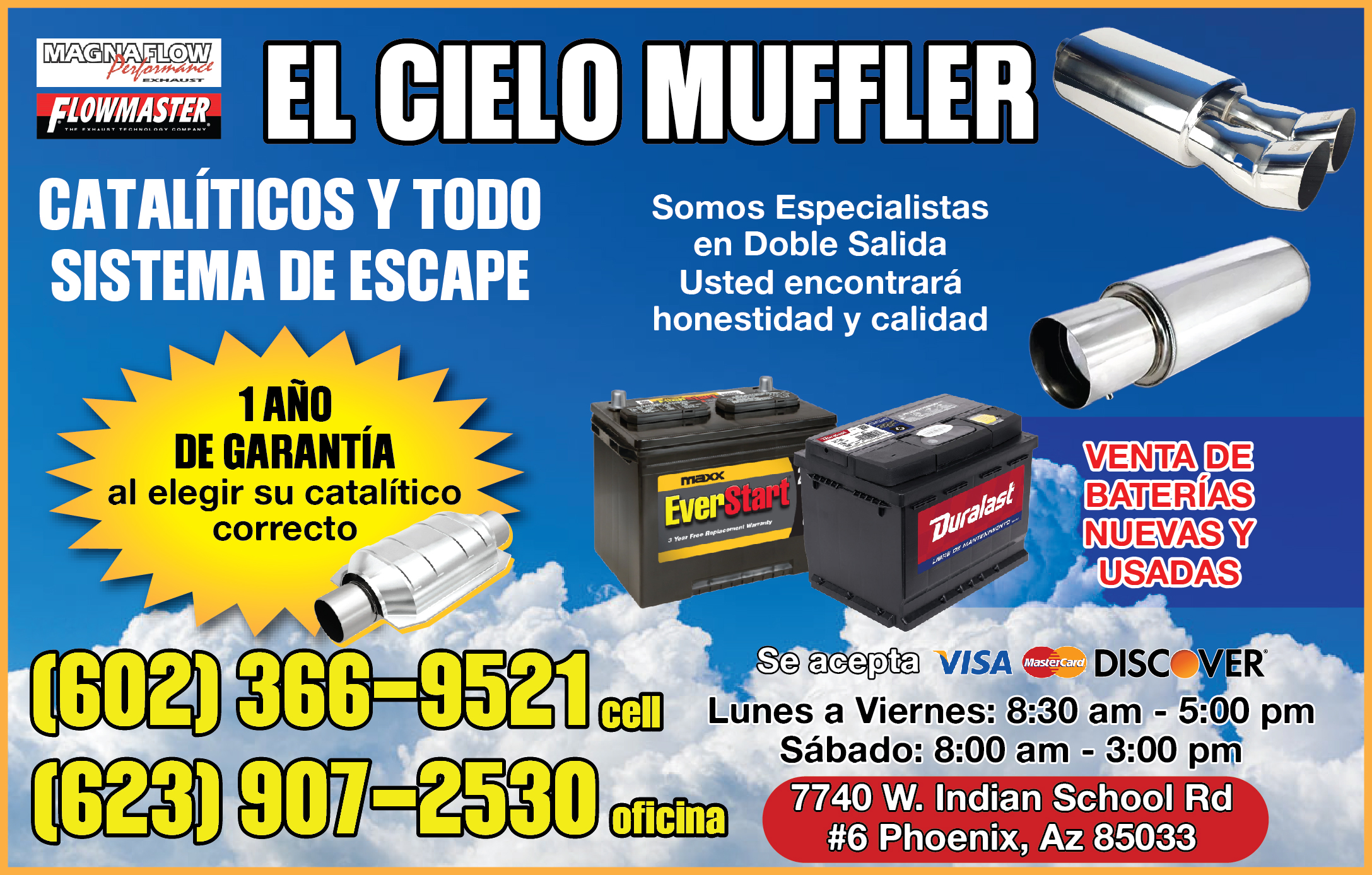 ✅ Catalíticos: Contamos con las mejores marcas como Magnaflow y Flowmaster. 🛡️ Garantía Real: ¡Te damos 1 año de garantía al elegir el catalítico correcto para tu vehículo! ✅ Todo el Sistema de Escape: Expertos en instalaciones de doble salida para un mejor rendimiento y estilo. 🔋 Venta de Baterías: Tenemos opciones nuevas y usadas para que nunca te quedes tirado.