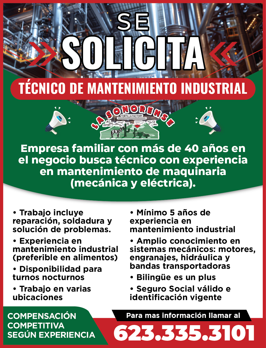 ¿Te interesa? No pierdas la oportunidad de trabajar en una empresa sólida. ☎️ Llama al 623-335-3101