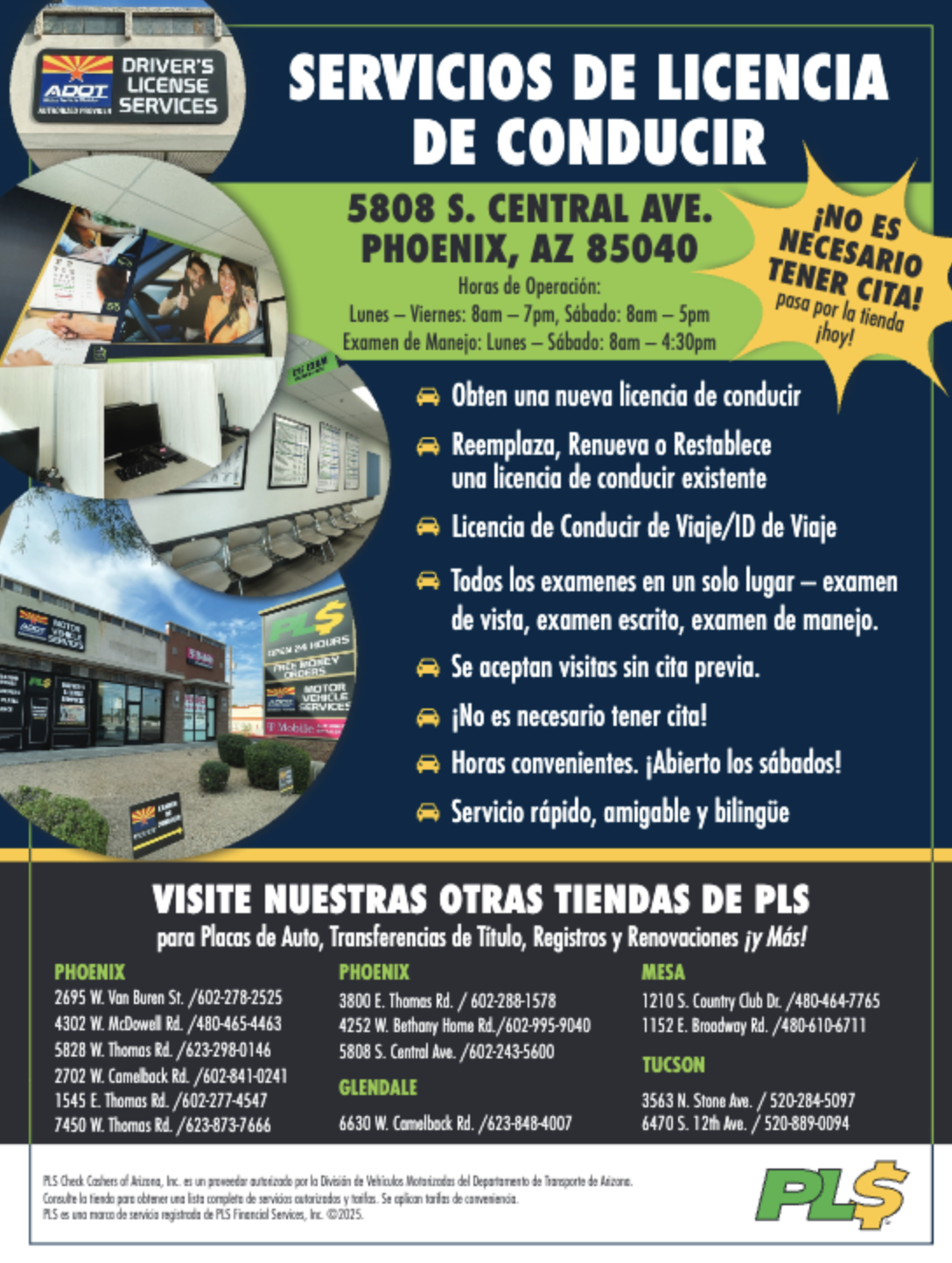 ¿Cansado de esperar semanas por una cita en el MVD? En PLS Driver’s License Services, ¡no necesitas cita previa! Simplemente pasa por nuestra tienda y realiza todos tus trámites en un solo lugar.