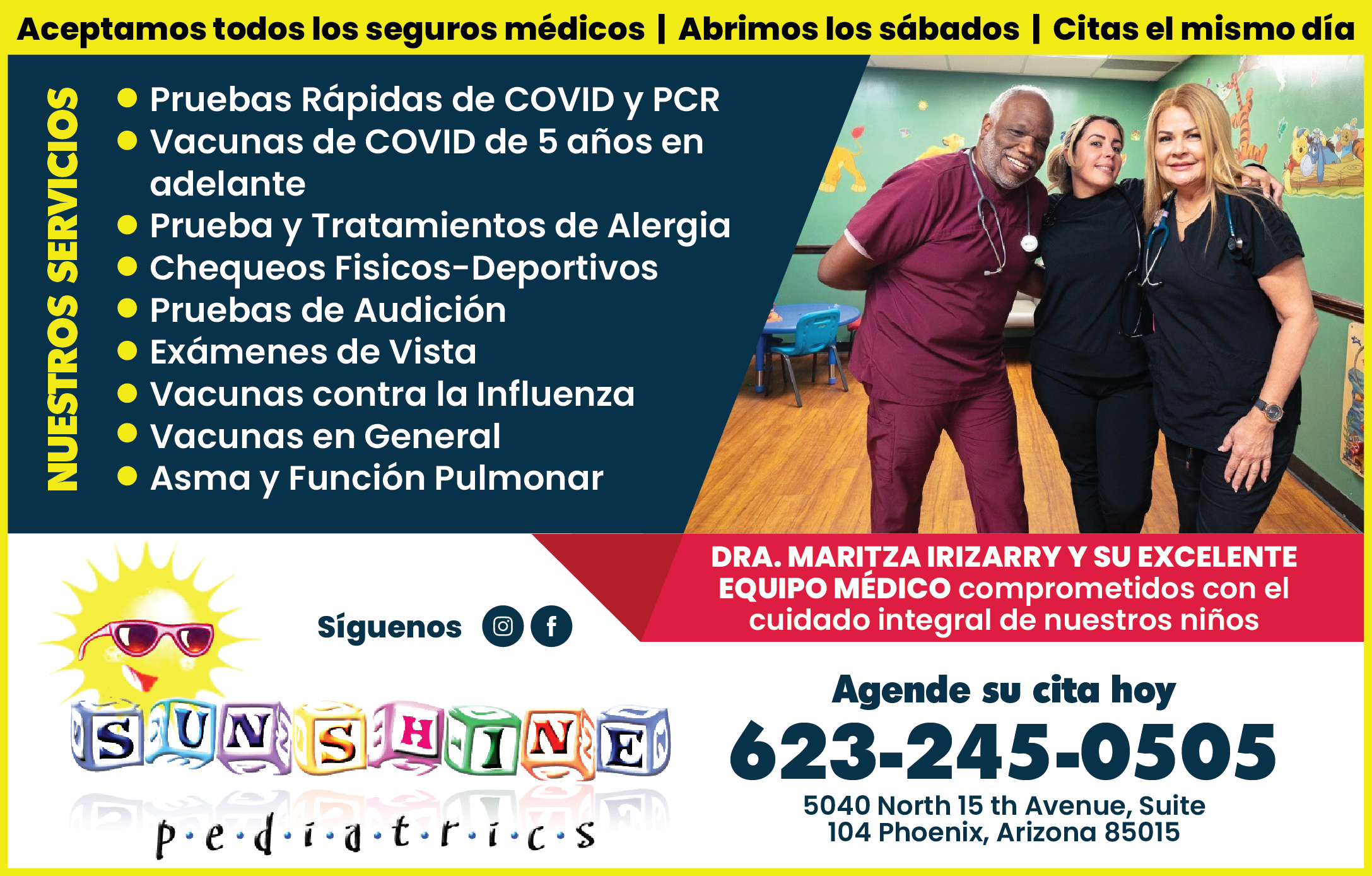 En Sunshine Pediatrics, nos dedicamos al cuidado integral de la salud infantil en un ambiente cálido y profesional. Aceptamos todos los seguros médicos y ofrecemos citas el mismo día para tu comodidad.